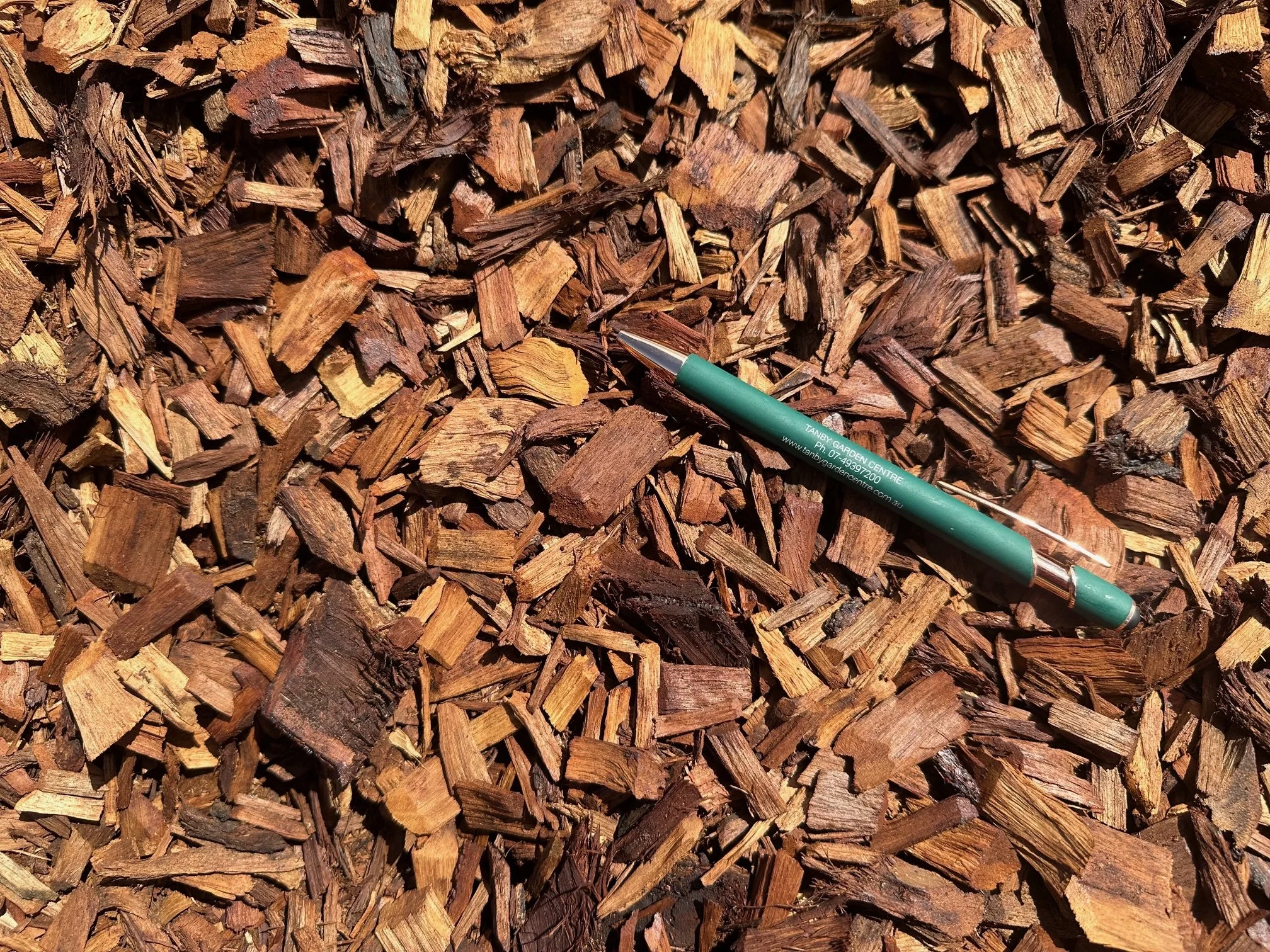 Chips of hardwood is a great option for mulching your gardens. As it is chips it lasts longer than Loppers mulch and does grey over time.