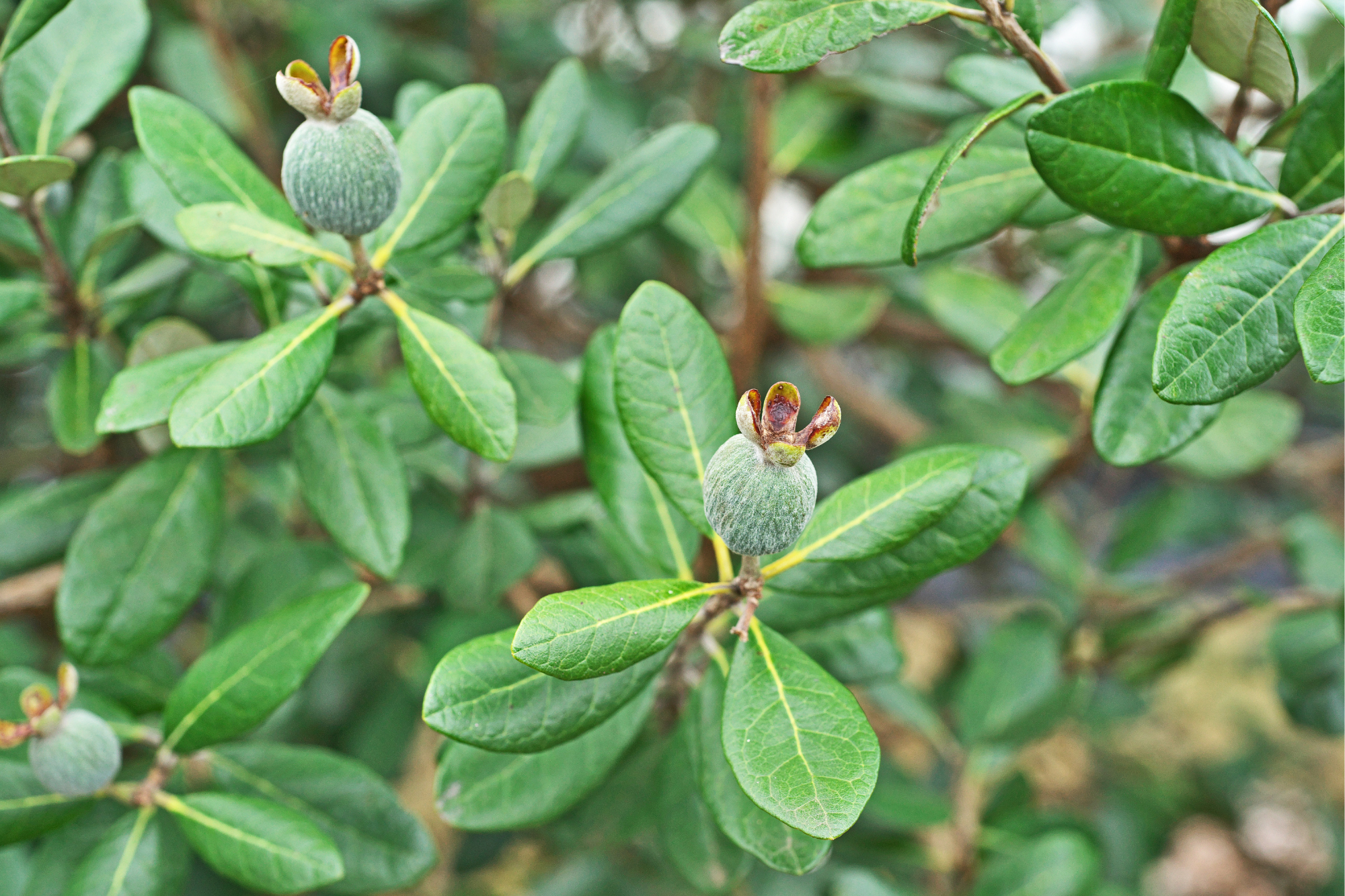The Feijoa is an attractive shrub that can reach 4 to 5 metres, native to the cooler parts of Brazil and Argentina. In our region, it grows well as an ornamental shrub in most soils but needs a cool winter to set fruit. Therefore it can be hit and miss as to whether you will get fruit on it in our climate. Two plants are needed for pollination. They are slightly salt-tolerant and can be grown as a hedge. The fruit (if you’re lucky enough to get some) emits a strong long-lasting perfume and is sweet, tasting of a mix of pineapple and guava.