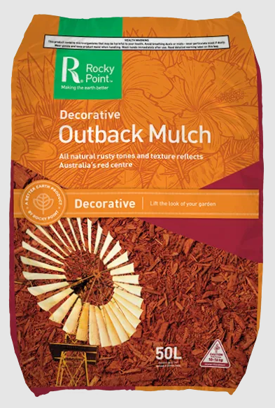 With its iron-rust colouring and rugged texture Rocky Point’s Outback Mulch reflects Australia’s red centre, and keeps plants nourished and protected from our harsh climate for up to 12 months.