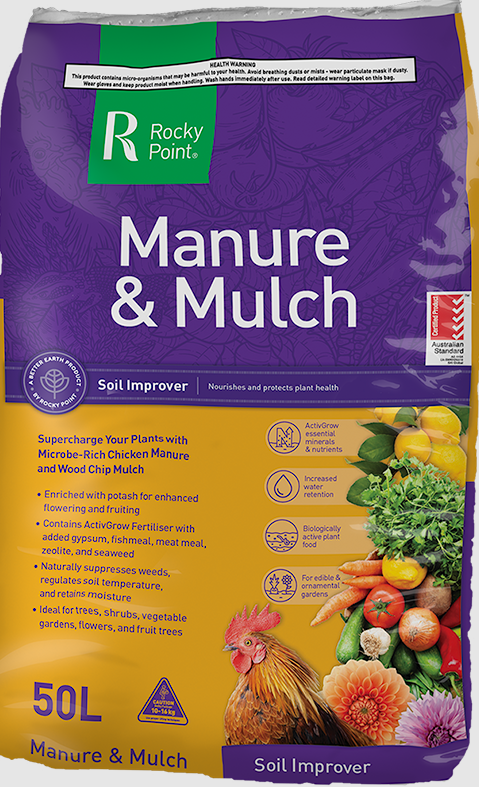 Manure & Mulch is designed to boost soil health and nutrient cycling with its microbe-rich, biologically active blend. Made from organic chicken manure, wood chips, wood shavings, and ActivGrow—which contains gypsum, potash, fishmeal, meat meal, zeolite, and seaweed—this blend promotes spectacular growth.